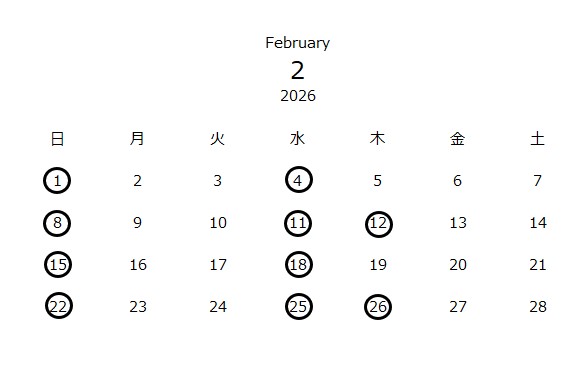 2026年2月の営業カレンダーです。